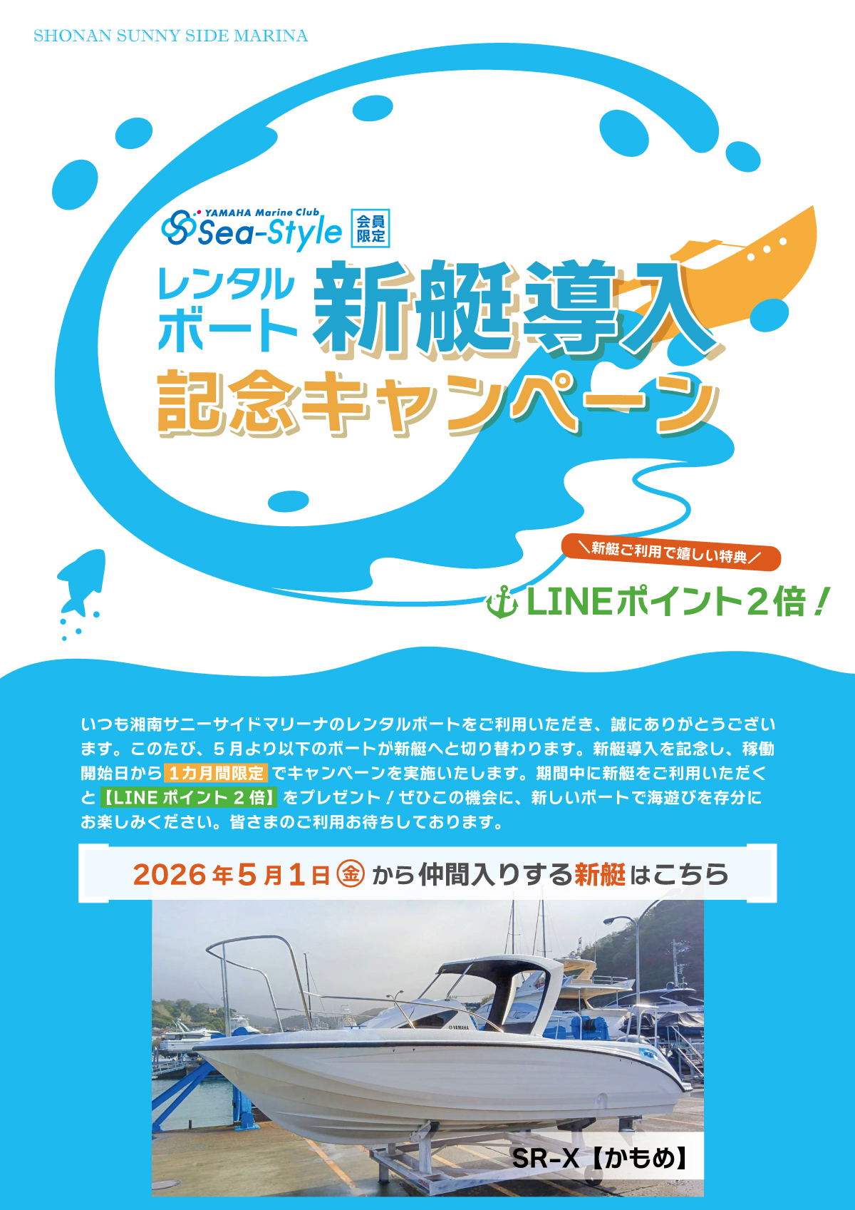 2.当マリーナで用意していますお子様用のライフジャケットは数に限りがあります。(少年用10着、幼児用2着) お子様連れでご利用の場合は、ご持参くださるようご協力をお願いします。