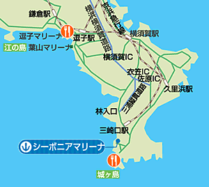 ・第三京浜又は首都高速横羽線⇒横浜新道⇒横浜横須賀道路を横須賀方面へ向かい、衣笠IC降りる⇒三浦縦貫道、林入口左折⇒国道134号線⇒油壷入口右折して5分。